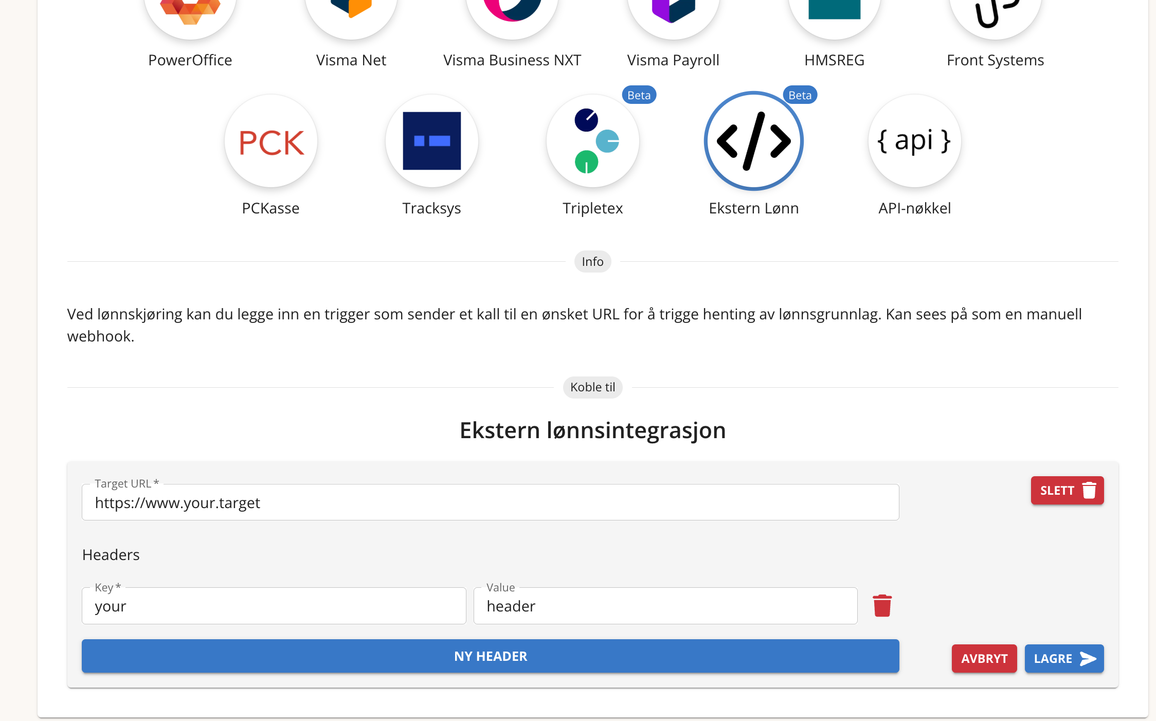 This solution enables you to build your own payroll integration. Once payroll processing is completed in Tidsbanken, a JSON payload can be sent to a user-defined endpoint with customizable headers. Below is an example of the payload sent.